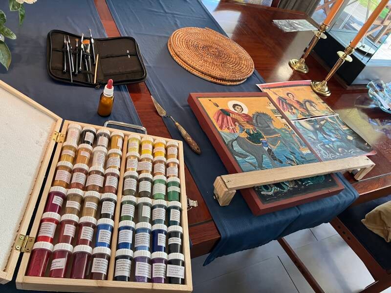 De schilderijen zijn uitgevoerd in ei/tempera op een houten paneel."
